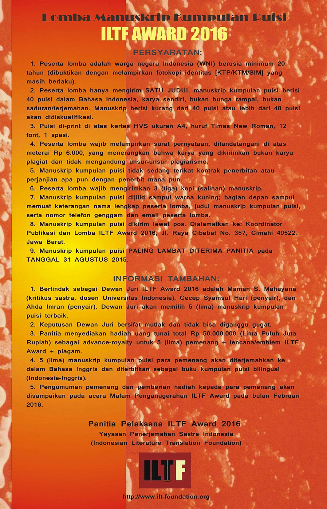 Berikut adalah syarat, ketentuan, dan informasi lain mengenai “Lomba Manuskrip Kumpulan Puisi ILTF Award 2016″.
